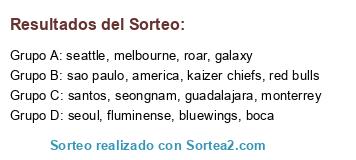 Lista de participantes: galaxy, seoul, boca, america, guadalajara, red bulls, santos, melbourne, monterrey, seattle, seongnam, bluewings, roar, kaizer chiefs, sao paulo, fluminense.
