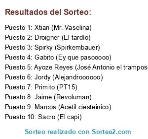 Lista de participantes: Primito (PT15), Jordy (Alejandroooooo), Marcos (Acetil ciesteinico), Gabito (Ey que pasooooo), Sacro (El capi), Spirky (Spirkembauer), Jaime (Revoluman), Droigner (El tardío), Xtian (Mr. Vaselina), Ayoze Reyes (José Antonio el tramposo).