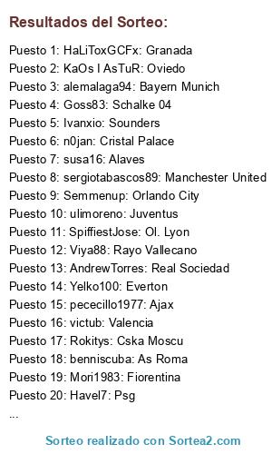 Lista de participantes: Adriantr127: Atco. de Madrid, adrylito: Malaga, alead71: Tottenham, alemalaga94: Bayern Munich, Alex1493: Hamburgo, alexfcbarcelona: Borussia Dortmund, AlexvsF1: Norwich City, AndrewTorres: Real Sociedad, Balles: Malmoe, benniscuba: As Roma, buijin: Celtic, CometHeaven79: Chelsea, cudeiro: Ath. Bilbao, Dakarri: B. Moenchegladbad, DaniBke: New York City, danygp89: Bournomounth, davidrikoone: Sp. Lisboa, El8Pelocho: Lugo, Ergion46: Monaco, ferminnn: Nantes, Goss83: Schalke 04, haankko888: Los Angeles Galaxy, HaLiToxGCFx: Granada, Havel7: Psg, iGosling v9: Arsenal, Ivanxio: Sounders, javitr: Manchester City, josegomisortega: Aston Villa, KaOs I AsTuR: Oviedo, lorenbb: Ol. Marsella, Luispro0103: River Plate, merayombasogo: Ponferradina, misterserpico: West Ham, Mori1983: Fiorentina, MrMohamRam: Liverpool, n0jan: Cristal Palace, NandoBel78: Real Madrid, Nelsonriko: Napoles, pececillo1977: Ajax, perikinho90: Cordoba, pinolines: Sevilla, Platero17: Oporto, Red Dutti: Bayer Leverkusen, Rokitys: Cska Moscu, Saavexbox: Las Palmas, Semmenup: Orlando City, sergiord14: Wolfsburgo, sergiotabascos89: Manchester United, SpiffiestJose: Ol. Lyon, SrPistolas86: Udinese, StormFury: Elche, susa16: Alaves, tabascos89: Barcelona, TATO XD: Depor, TheForceMaker: Alcorcon, toni1708: Celta, trunks: Levante, ulimoreno: Juventus, victub: Valencia, Viya88: Rayo Vallecano, x chachiquesi x: Betis, xSAMU: Benfica, Yelko100: Everton, zzzz jona zzzz: Boca.