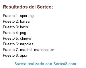 Lista de participantes: ajax, betis, madrid- manchester, barsa, psg, chievo, napoles, sporting.