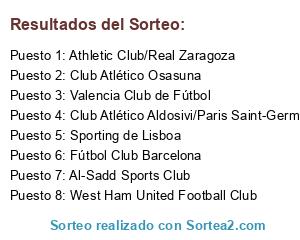 Lista de participantes: Club Atlético Osasuna, Fútbol Club Barcelona, Valencia Club de Fútbol, West Ham United Football Club, Sporting de Lisboa, Al-Sadd Sports Club, Athletic Club/Real Zaragoza, Club Atlético Aldosivi/Paris Saint-Germain Football Club.