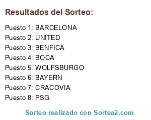 Lista de participantes: BARCELONA, WOLFSBURGO, CRACOVIA, UNITED, PSG, BOCA, BAYERN, BENFICA.