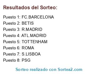 Lista de participantes: PSG, TOTTENHAM, ATL.MADRID, BETIS, S.LISBOA, FC.BARCELONA, ROMA, R.MADRID.
