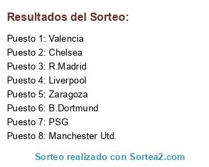 Lista de participantes: Liverpool, Zaragoza, Chelsea, B.Dortmund, R.Madrid, Valencia, PSG, Manchester Utd..