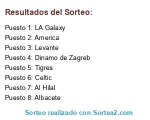 Lista de participantes: Levante, Tigres, Celtic, America, Al Hilal, Dinamo de Zagreb, Albacete, LA Galaxy.