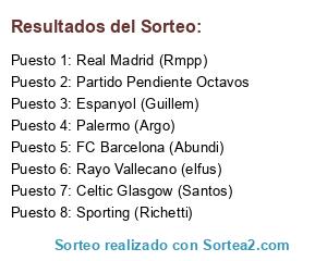 Lista de participantes: FC Barcelona (Abundi), Real Madrid (Rmpp), Celtic Glasgow (Santos), Palermo (Argo), Sporting (Richetti), Espanyol (Guillem), Rayo Vallecano (elfus), Partido Pendiente Octavos.