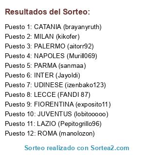 Lista de participantes: MILAN (kikofer), INTER (Jayoldi), JUVENTUS (lobitooooo), NAPOLES (Murill069), ROMA (manolozon), FIORENTINA (exposito11), LAZIO (Pepitogrillo96), UDINESE (izenbako123), PARMA (sanmaa), PALERMO (aitorr92), LECCE (FANDI 87), CATANIA (brayanyruth).