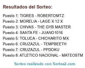Lista de participantes: ATLETICO NACIONAL - MATEOSTM, CHIVAS - THE GYB MASTER, MORELIA - LAGE X 12 X, TIGRES - ROBERTOMTZ, SANTA FE - JUANO1016, CRUZAZUL - TEMPBEETH, TOLUCA - CHICHARITO MX, CRUZAZUL - PPDOKU.