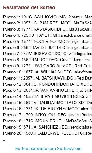 Lista de participantes: 13 RUBEN VEZO DFC javitr Racing Santander, 19 S. SALIHOVIC MC Xsamu Manchester United, 24 V. IBISEVIC DC Crivi Llagostera, 26 G. CASTRO MC MaDaScAs Ac Milan, 28 S. REINARTZ MCD Xsamu Manchester United, 38 A. POTUK MCO javitr Racing Santander, 42 RAFINHA LD MaDaScAs Ac Milan, 51 M. GOMEZ DC Red Dutti Granada, 62 M. HUMMELS DFC Xsamu Manchester United, 63 M. SCHMELZER LI alexfcbarcelona Recreativo, 64 S. BENDER MCD Red Dutti Granada, 82 J. DROBNY POR alexfcbarcelona Recreativo, 84 D. AOGO LI TATOXD Depor, 90 K. BELLARABI MD Red Dutti Granada, 113 J. MBAKOGU DC Red Dutti Granada, 141 M. SCHAFER LI Xsamu Manchester United, 144 H. KANE DC TATO XD Depor, 152 LUCAS PIAZON EI sergiotabascos89 Real Madrid, 155 SOKRATIS DFC Xsamu Manchester United, 156 NALDO DFC Crivi Llagostera, 189 E. INSUA LI Crivi Llagostera, 198 RAFA EI Red Dutti Granada, 210 VIEIRINHA MD Xsamu Manchester United, 223 D. TADIC MCO TATO XD Depor, 245 JOSE BOSINGWA LD sergiotabascos89 Real Madrid, 251 F. LAMPARD MC Crivi Llagostera, 256 DAVID LUIZ DFC sergiotabascos89 Real Madrid, 260 J. MIKEL MCD Crivi Llagostera, 266 T. HOWARD POR Xsamu Manchester United, 269 S. DISTIN DFC TATO XD Depor, 270 L. BAINES LI MaDaScAs Ac Milan, 295 PEPE REINA POR alexfcbarcelona Recreativo, 301 S. GERRARD MCD Xsamu Manchester United, 315 M. RICHARDS LD sergiotabascos89 Real Madrid, 316 V. KOMPANY DFC sergiotabascos89 Real Madrid, 318 G. CLICHY LI sergiotabascos89 Real Madrid, 328 A. JOHNSON MD alexfcbarcelona Recreativo, 329 E. DZEKO DC sergiotabascos89 Real Madrid, 330 M. BALOTELLI DC MaDaScAs Ac Milan, 331 A. KOLAROV LI Crivi Llagostera, 343 T. CLEVERLEY MC javitr Racing Santander, 358 D. BERBATOV DC Xsamu Manchester United, 364 F. COLOCCINI DFC TATO XD Depor, 366 ADRIEN SILVA MC javitr Racing Santander, 369 V. DARIDA MC TATO XD Depor, 378 A. TAARABT MCO Xsamu Manchester United, 381 R. HUTH DFC MaDaScAs Ac Milan, 389 M. UPSON DFC alexfcbarcelona Recreativo, 408 K. WALKER LD sergiotabascos89 Real Madrid, 427 SANDRO MCD alexfcbarcelona Recreativo, 431 B. FOSTER POR sergiotabascos89 Real Madrid, 436 J. STONES DFC alexfcbarcelona Recreativo, 465 I. WILLIAMS DC javitr Racing Santander, 489 M. ARROYO EI MaDaScAs Ac Milan, 496 A. MARTIAL DC Xsamu Manchester United, 501 R. GUERREIRO MI TATO XD Depor, 544 LEO BAPTISTAO MD TATO XD Depor, 556 GROSICKI ED Crivi Llagostera, 626 S. ETO'O**** DC sergiotabascos89 Real Madrid, 633 K. HONDA MCO Xsamu Manchester United, 637 Z. TOSIC MD MaDaScAs Ac Milan, 649 GUILHERME POR Xsamu Manchester United, 652 F. CAICEDO DC MaDaScAs Ac Milan, 725 D. PAYET MI alexfcbarcelona Recreativo, 734 AZPILICUETA LI javitr Racing Santander, 735 S. DIAWARA DFC MaDaScAs Ac Milan, 754 H. LLORIS POR MaDaScAs Ac Milan, 762 B. GOMIS DC alexfcbarcelona Recreativo, 775 J. PASTORE MC MaDaScAs Ac Milan, 834 IRAOLA LD Xsamu Manchester United, 863 SERGIO BUSQUETS MCD Crivi Llagostera, 871 A. SANCHEZ ED sergiotabascos89 Real Madrid, 897 J. TOULALAN MCD Xsamu Manchester United, 904 S. RONDON DC TATO XD Depor, 918 ROMARIC MC TATO XD Depor, 925 CHORI CASTRO EI Red Dutti Granada, 929 CASILLAS POR sergiotabascos89 Real Madrid, 933 MARCELO LI javitr Racing Santander, 945 RAUL ALBIOL DFC MaDaScAs Ac Milan, 966 JAVI VARAS POR MaDaScAs Ac Milan, 979 I. RAKITIC MCO TATO XD Depor, 1009 J. DE GUZMAN MCO TATO XD Depor, 1013 G. ROSSI**** DC sergiotabascos89 Real Madrid, 1035 Z. IBRAHIMOVIC DC Crivi Llagostera, 1057 G. RAMIREZ MCO MaDaScAs Ac Milan, 1060 D. ASTORI DFC Crivi Llagostera, 1096 G. MESTO LD alexfcbarcelona Recreativo, 1129 A. POLI MC TATO XD Depor, 1141 E. ELIA MD sergiotabascos89 Real Madrid, 1149 L. BONUCCI DFC Crivi Llagostera, 1161 S. RADU LI Xsamu Manchester United, 1177 P. CANNAVARO DFC Red Dutti Granada, 1181 W. GARGANO MC alexfcbarcelona Recreativo, 1207 S. GIOVINCO MP sergiotabascos89 Real Madrid, 1219 BOJAN ED Xsamu Manchester United, 1261 C. RODRIGUEZ MI Crivi Llagostera, 1275 M. PEREIRA LD TATO XD Depor, 1279 JAVI GARCIA MCD Red Dutti Granada, 1331 K. DE BRUYNE MCO alexfcbarcelona Recreativo, 1397 C. CHANTOME**** MC Red Dutti Granada, 1424 F. LODI MCD Crivi Llagostera, 1434 A. MUSA DC Xsamu Manchester United, 1500 M. PERIN POR TATO XD Depor, 1504 F. DELPH MC sergiotabascos89 Real Madrid, 1630 M. OLSSON LI sergiotabascos89 Real Madrid, 1637 K. VERMEER POR Crivi Llagostera, 1647 F. MARCHETTI POR TATO XD Depor, 1661 V. MALAFEEV POR Red Dutti Granada, 1669 K. MIRALLAS MD TATO XD Depor, 1677 NOCERINO MC sergiotabascos89 Real Madrid, 1684 R. VARGAS MCO MaDaScAs Ac Milan, 1687 NZOGBIA MCO sergiotabascos89 Real Madrid, 1693 YANBAEV LD Crivi Llagostera, 1700 S. DIARRA MI Xsamu Manchester United, 1702 EMENIKE DC Crivi Llagostera, 1709 N`KOLOU DFC javitr Racing Santander, 1715 MOUNIER EI MaDaScAs Ac Milan, 1716 BIABIANY ED Crivi Llagostera, 1717 BERIA LD TATO XD Depor, 1730 ERIKSEN MI alexfcbarcelona Recreativo, 1737 JELAVIC DC Xsamu Manchester United, 1745 LARS BENDER MC Xsamu Manchester United, 1748 SILVESTRE DFC MaDaScAs Ac Milan, 1750 RAMIRES MCD sergiotabascos89 Real Madrid, 1753 T. KROOS MC javitr Racing Santander, 1755 C. VELA ED javitr Racing Santander, 1759 MARIANO LD Red Dutti Granada, 1774 MOUSA SISSOKO MD sergiotabascos89 Real Madrid, 1775 EL SHAARAWY EI javitr Racing Santander, 1776 YANGA MBIWA DFC alexfcbarcelona Recreativo, 1777 NASTASIC DFC MaDaScAs Ac Milan, 1791 MICHU DC MaDaScAs Ac Milan, 1809 RODRIGO DC alexfcbarcelona Recreativo, 1815 DEULOFEU ED alexfcbarcelona Recreativo, 1826 R. VARANE DFC javitr Racing Santander, 1829 S. SAM ED alexfcbarcelona Recreativo, 1832 I. ASPAS DC Xsamu Manchester United, 1837 IBAI GOMEZ EI TATO XD Depor, 1841 I. OPARA DFC Red Dutti Granada, 1875 A. BEGOVIC POR javitr Racing Santander, 1877 A. WILLIANS DFC alexfcbarcelona Recreativo, 1898 V. ANITA MCD MaDaScAs Ac Milan, 1908 R. ELM MCD Red Dutti Granada, 1915 D. DIEKMEIER LD alexfcbarcelona Recreativo, 1917 A. MARIAPPA DFC javitr Racing Santander, 1931 R. KRUSE MD javitr Racing Santander, 1952 SILVIO LD Crivi Llagostera, 1956 L.