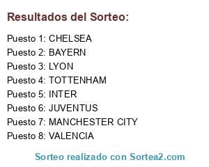 Lista de participantes: TOTTENHAM, BAYERN, VALENCIA, LYON, JUVENTUS, MANCHESTER CITY, INTER, CHELSEA.