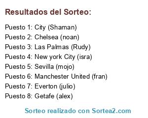 Lista de participantes: Las Palmas (Rudy), Manchester United (fran), New york City (isra), City (Shaman), Getafe (alex), Chelsea (noan), Everton (julio), Sevilla (mojo).
