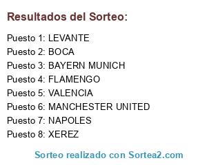 Lista de participantes: VALENCIA, NAPOLES, FLAMENGO, LEVANTE, BOCA, MANCHESTER UNITED, XEREZ, BAYERN MUNICH.