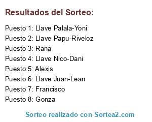 Lista de participantes: Gonza, Francisco, Llave Papu-Riveloz, Alexis, Rana, Llave Nico-Dani, Llave Juan-Lean, Llave Palala-Yoni.