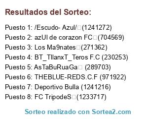 Lista de participantes: Los Ma9nates (271362), AsTaBuRuaGa (289703), /Escudo- Azul/ (1241272), THEBLUE-REDS.C.F (971922), azUl de corazon FC (704569), BT_TllanxT_Teros F.C (230253), Deportivo Bulla (1241216), FC TripodeS (1233717).