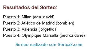 Lista de participantes: Atlético de Madrid (bombien), Milan (ega_david), Valencia (jorgetkd), Olympique Marsella (pedrozidane).