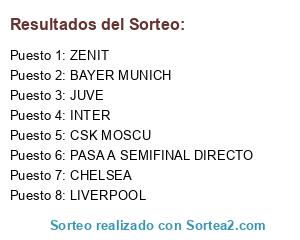 Lista de participantes: CSK MOSCU, BAYER MUNICH, LIVERPOOL, CHELSEA, ZENIT, INTER, JUVE, PASA A SEMIFINAL DIRECTO.