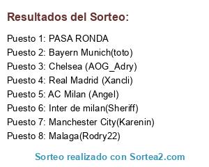 Lista de participantes: Malaga(Rodry22), Bayern Munich(toto), Manchester City(Karenin), Inter de milan(Sheriff), AC Milan (Angel), Real Madrid (Xancli), Chelsea (AOG_Adry), PASA RONDA.