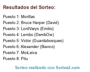 Lista de participantes: Alexander (Bianco), Morillas, Pitu, Bruce Harper (David), Lembo (DembOw), LordVarys (Emilio), MoiLeiva, Victor (Guardabosques).