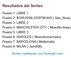 Lista de participantes: LIBRE 1, LIBRE 2, LIBRE 3, NAPOLES ( Mounstromercado), BORUSSIA DORTMUND ( Naz_Ross), MILAN ( Jemi666), BARCELONA ( Mellarirafa), MANCHESTER CITY ( Albertillo-Aiwa).