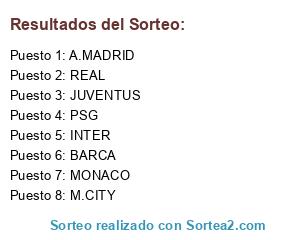 Lista de participantes: REAL, A.MADRID, JUVENTUS, PSG, MONACO, BARCA, INTER, M.CITY.