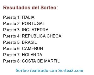 Lista de participantes: ITALIA, COSTA DE MARFIL, INGLATERRA, PORTUGAL, CAMERUN, BRASIL, REPUBLICA CHECA, HOLANDA.