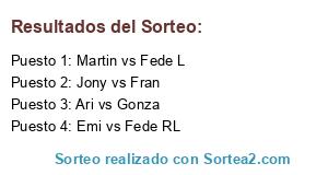 Lista de participantes: Jony vs Fran, Martin vs Fede L, Emi vs Fede RL, Ari vs Gonza.