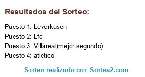 Lista de participantes: atletico, Lfc, Leverkusen, Villareal(mejor segundo).