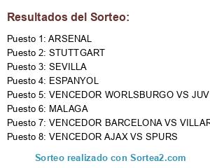 Lista de participantes: ARSENAL, ESPANYOL, SEVILLA, MALAGA, STUTTGART, VENCEDOR AJAX VS SPURS, VENCEDOR BARCELONA VS VILLARREAL, VENCEDOR WORLSBURGO VS JUVENTUS.