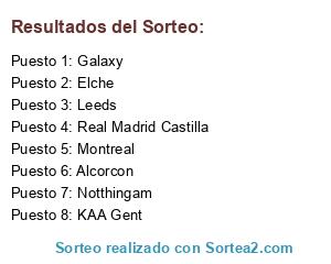 Lista de participantes: Alcorcon, Leeds, Elche, Montreal, Real Madrid Castilla, Notthingam, Galaxy, KAA Gent.