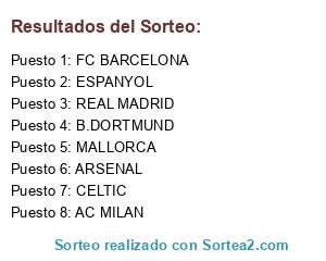 Lista de participantes: AC MILAN, FC BARCELONA, ESPANYOL, ARSENAL, CELTIC, B.DORTMUND, REAL MADRID, MALLORCA.