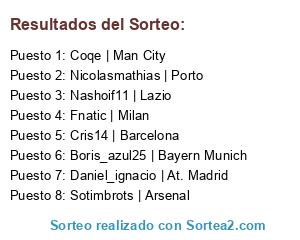Lista de participantes: Cris14 | Barcelona, Fnatic | Milan, Coqe | Man City, Boris_azul25 | Bayern Munich, Daniel_ignacio | At. Madrid, Nicolasmathias | Porto, Nashoif11 | Lazio, Sotimbrots | Arsenal.