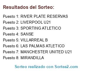 Lista de participantes: SPORTING ATLETICO, RIVER PLATE RESERVAS, LAS PALMAS ATLETICO, MANCHESTER UNITED U21, LIVERPOOL U21, SANSE, VILLARREAL B, MIRANDILLA.