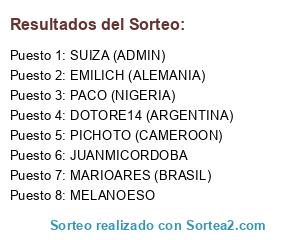 Lista de participantes: SUIZA (ADMIN), DOTORE14 (ARGENTINA), EMILICH (ALEMANIA), PICHOTO (CAMEROON), PACO (NIGERIA), MARIOARES (BRASIL), JUANMICORDOBA, MELANOESO.