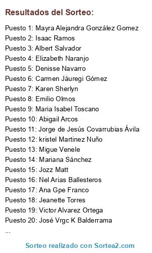 Lista de participantes: Mariana Sánchez (18 participaciones), Fernando Razo (7 participaciones), Maria Isabel Toscano (11 participaciones), Ariday Ruvalcaba Carrera (7 participaciones), kristel Martinez Nuño , Felipe Sánchez (3 participaciones), Ana Cortés (3 participaciones), Jaime Carrera Retana (7 participaciones), Marina Zamora , María Elizabeth Covarrubias Ávila , Guadalupe Gutiérrez (5 participaciones), Felipe Curiel (4 participaciones), Angeles Castillo , Denisse Navarro , José Vrgc K Balderrama (2 participaciones), Dyna de Leon , Silvia Bogarin (2 participaciones), Ana Delia Avila , Jorge de Jesús Covarrubias Ávila (2 participaciones), Qv Ware (3 participaciones), Miriam Muro (2 participaciones), Wendy Care (2 participaciones), Jessi Care , Ernesto Ávila (2 participaciones), Abigail Arcos , Elyzabeth Flores Ramírez , Melany Andrea Ceballos Loera , Margarita Rodríguez Ramírez , Jesús Alejandro , Martha Elva Chacon Cardenas , Nel Arias Ballesteros (16 participaciones), Lizette Ramírez , Lourdes Isabel Larios , Albert Aguilar , Danahe Santana Garcia , Ana Bertha Ibarra Contreras , Ale Sedano (2 participaciones), Emilio Olmos , Daniel Ponce De Anda , Isaac Ramos , Ale Hernández , Victor Alvarez Ortega (3 participaciones), Venya Querida Paulina , Ciinthyya Torres , Aracely Rodríguez , Anda Delia Avila (2 participaciones), Leon Figueroa , Andra Velazquez , Telvi Garcia (5 participaciones), María de las Nieves Jáuregui Gómez , Naty Campos , Carmen Jáuregi Gómez , Gabriela Thomsen , Araceli Rodríguez , Susana Velazquez , Liz Treviño , Gregorio Ruiz , Aurora Vazquez , Lizbeth Dzoara Rangel Hernandez (2 participaciones), Kimberly Rodriguez , Lidia Olivares , Pablo Pérez , Isabel Díaz , Manuel Rubio , Karen Sherlyn (3 participaciones), Miriam Maribel , Zoe Aranda , Liz Gómez , Mariano Díaz , Vianey Chavez Ornelas , Susana Ayala , Villa D Melendrez , CrRiisty Morales , Elizabeth Naranjo (11 participaciones), Jeanette Torres , Susana Torres , Gabriel Serrano Ocegueda , Miriam Montes , Abraham Reyes , Mary Gely Ruel Ro , Karina Corona , Alfredo Rojas Ortega , Ana Gpe Franco , Ana Sánchez , Alondra Fond , Rosario Olvera Canchola , Rocío Olvera Canchola , Jose Olvera Canchola , Maria Del Refugio Olvera , Fernanda Ramírez , Ámelie Isabella , Jessica Villalpando Villaseñor , Jose Ochoa Díaz , Nayeli F. Díaz de Leon (2 participaciones), Keno Lemon , Viviana Cp (2 participaciones), Estrellita del Cielo , Carlos Pzo , Yahir Garcia Haro , Jorge Gardilla , Aliicia Jacqueline (2 participaciones), Jozz Matt , Samanda Barreto Hurtado , Pathi Villarruel , Ulises Santana Nuñez , Norma Tafoya , Nick Osorio , Wendy Alejandra Estrada , Betty Lopez(2 participaciones), Teresa Bogarin , Michell Hernández , Isabel Madriz , Sayuri Ruiz , Mayra Alejandra González Gomez , Alma Medrano , Abundia Paredes , Albert Salvador (2 participaciones), Jose Reynoso , Gaby Lorenzana Gaby , Kevin Sanches Alonso , Milena Carrillo Guzman , Ricardo Valdez Lopez , Carlito D Maniacks, Migue Venele , Susy Rodriguez , Tanizz Fdz , Lilys Regalado , Isabel Avila Castillo , Marisol Mora , Camila Rueda , Cesar Osman Velasco Gomez , Alejandra Aguilar , Montse Del Castillo , Jesús Muñoz Romero , Dalmiro Garcia Urias , Firex Moran Hdz , Tumtun Moran Hernández , Angel Sanchez.