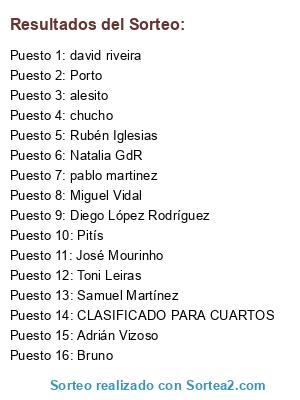 Lista de participantes: José Mourinho, alesito, Adrián Vizoso, Toni Leiras, chucho, david riveira, Miguel Vidal, Diego López Rodríguez, Natalia GdR, Samuel Martínez, Rubén Iglesias, Bruno, pablo martinez, Pitís, Porto, CLASIFICADO PARA CUARTOS.