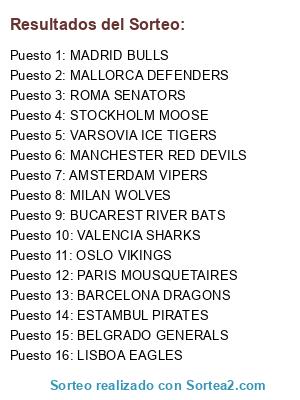 Lista de participantes: MILAN WOLVES, BUCAREST RIVER BATS, STOCKHOLM MOOSE, VARSOVIA ICE TIGERS, MALLORCA DEFENDERS, ESTAMBUL PIRATES, MANCHESTER RED DEVILS, MADRID BULLS, AMSTERDAM VIPERS, ROMA SENATORS, VALENCIA SHARKS, BELGRADO GENERALS, LISBOA EAGLES, BARCELONA DRAGONS, OSLO VIKINGS, PARIS MOUSQUETAIRES.