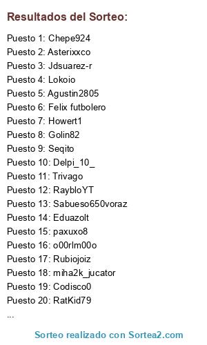 Lista de participantes: Eduazolt, RatKid79, Delpi_10_, Lokoio, o00rlm00o, Jdsuarez-r, Ivanvillalvaro-e, miha2k_jucator, paxuxo8, acm1991912, Rubiojoiz, Play_Codec, Codisco0, Chepe924, Proquet, Felix futbolero, Howert1, Sabueso650voraz, RaybloYT, Seqito, Agustin2805, Asterixxco, Trivago, Golin82.