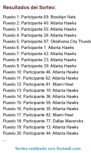 Lista de participantes: Participante 1: Atlanta Hawks, Participante 2: Atlanta Hawks, Participante 3: Atlanta Hawks, Participante 4: Atlanta Hawks, Participante 5: Atlanta Hawks, Participante 6: Atlanta Hawks, Participante 7: Atlanta Hawks, Participante 8: Atlanta Hawks, Participante 9: Atlanta Hawks, Participante 10: Atlanta Hawks, Participante 11: Atlanta Hawks, Participante 12: Atlanta Hawks, Participante 13: Atlanta Hawks, Participante 14: Atlanta Hawks, Participante 15: Atlanta Hawks, Participante 16: Atlanta Hawks, Participante 17: Atlanta Hawks, Participante 18: Atlanta Hawks, Participante 19: Atlanta Hawks, Participante 20: Atlanta Hawks, Participante 21: Atlanta Hawks, Participante 22: Atlanta Hawks, Participante 23: Atlanta Hawks, Participante 24: Atlanta Hawks, Participante 25: Atlanta Hawks, Participante 26: Atlanta Hawks, Participante 27: Atlanta Hawks, Participante 28: Atlanta Hawks, Participante 29: Atlanta Hawks, Participante 30: Atlanta Hawks, Participante 31: Atlanta Hawks, Participante 32: Atlanta Hawks, Participante 33: Atlanta Hawks, Participante 34: Atlanta Hawks, Participante 35: Atlanta Hawks, Participante 36: Atlanta Hawks, Participante 37: Atlanta Hawks, Participante 38: Atlanta Hawks, Participante 39: Atlanta Hawks, Participante 40: Atlanta Hawks, Participante 41: Atlanta Hawks, Participante 42: Atlanta Hawks, Participante 43: Atlanta Hawks, Participante 44: Atlanta Hawks, Participante 45: Atlanta Hawks, Participante 46: Atlanta Hawks, Participante 47: Atlanta Hawks, Participante 48: Atlanta Hawks, Participante 49: Atlanta Hawks, Participante 50: Atlanta Hawks, Participante 51: Atlanta Hawks, Participante 52: Atlanta Hawks, Participante 53: Atlanta Hawks, Participante 54: Atlanta Hawks, Participante 55: Atlanta Hawks, Participante 56: Atlanta Hawks, Participante 57: Atlanta Hawks, Participante 58: Atlanta Hawks, Participante 59: Atlanta Hawks, Participante 60: Atlanta Hawks, Participante 61: Atlanta Hawks, Participante 62: Atlanta Hawks, Participante 63: Atlanta Hawks, Participante 64: Brooklyn Nets, Participante 65: Brooklyn Nets, Participante 66: Brooklyn Nets, Participante 67: Brooklyn Nets, Participante 68: Brooklyn Nets, Participante 69: Brooklyn Nets, Participante 70: Brooklyn Nets, Participante 71: Dallas Mavericks, Participante 72: Dallas Mavericks, Participante 73: Dallas Mavericks, Participante 74: Dallas Mavericks, Participante 75: Dallas Mavericks, Participante 76: Dallas Mavericks, Participante 77: Dallas Mavericks, Participante 78: Miami Heat, Participante 79: Miami Heat, Participante 80: Miami Heat, Participante 81: Miami Heat, Participante 82: Miami Heat, Participante 83: Miami Heat, Participante 84: Miami Heat, Participante 85: New Orleans Pelicans, Participante 86: New Orleans Pelicans, Participante 87: New Orleans Pelicans, Participante 88: New Orleans Pelicans, Participante 89: New Orleans Pelicans, Participante 90: New Orleans Pelicans, Participante 91: New Orleans Pelicans, Participante 92: New Orleans Pelicans, Participante 93: Oklahoma City Thunder, Participante 94: Oklahoma City Thunder, Participante 95: Oklahoma City Thunder, Participante 96: Oklahoma City Thunder, Participante 97: Oklahoma City Thunder, Participante 98: Oklahoma City Thunder, Participante 99: Oklahoma City Thunder, Participante 100: Oklahoma City Thunde.