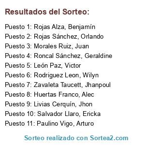 Lista de participantes: Huertas Franco, Alec, León Paz, Victor, Livias Cerquín, Jhon, Morales Ruiz, Juan, Paulino Vigo, Arturo, Rodriguez Leon, Wilyn, Rojas Alza, Benjamín, Rojas Sánchez, Orlando, Roncal Sánchez, Geraldine, Salvador Llaro, Ericka, Zavaleta Taucett, Jhanpoul.
