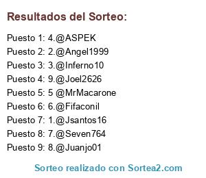 Lista de participantes: 1.@Jsantos16, 2.@Angel1999, 3.@Inferno10, 4.@ASPEK, 5 @MrMacarone, 6.@Fifaconil, 7.@Seven764, 8.@Juanjo01, 9.@Joel2626.