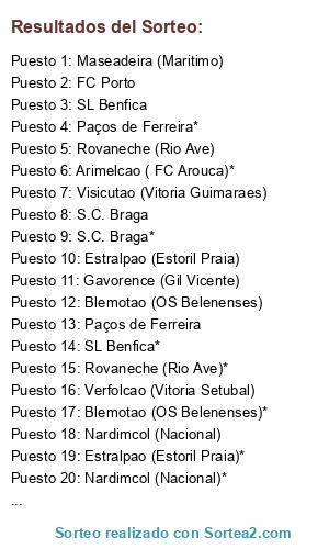 Lista de participantes: FC Porto, SL Benfica, S.C. Braga, Paços de Ferreira, Aratalcao (Académica Coimbra), Arimelcao ( FC Arouca), Blemotao (OS Belenenses), Estralpao (Estoril Praia), Gavorence (Gil Vicente), Maseadeira (Maritimo), Nardimcol (Nacional), Osquancha (Olhanense), Rovaneche (Rio Ave), Esportiva (Sporting Lisboa), Visicutao (Vitoria Guimaraes), Verfolcao (Vitoria Setubal), FC Porto*, SL Benfica*, S.C. Braga*, Paços de Ferreira*, Aratalcao (Académica Coimbra)*, Arimelcao ( FC Arouca)*, Blemotao (OS Belenenses)*, Estralpao (Estoril Praia)*, Gavorence (Gil Vicente)*, Maseadeira (Maritimo)*, Nardimcol (Nacional)*, Osquancha (Olhanense)*, Rovaneche (Rio Ave)*, Esportiva (Sporting Lisboa)*, Visicutao (Vitoria Guimaraes)*, Verfolcao (Vitoria Setubal)*.