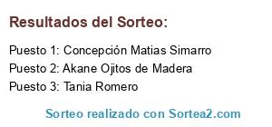 Lista de participantes: Perla Maria Santos Lucio, Paloma Garcia Rabadan, Mati Lopez Rodríguez, Nagore Arostegui Rojo, Paz Crespo, Elena Knyazhechenko, Tania Romero, Carmen Garcia Magadan, Laura Ruiz Godoy, Rosario GT, Concepción Matias Simarro, Sandra Sabariego, Akane Ojitos de Madera, Amaia Torres Sánchez, Kela DE Estrada, Encarni Estévez, Gloria Urquidi, La casita de Alibea, Charo Romero Álvarez, Pilar Gil Costa, Cristina Soria Vilella, Jaime A González, Jennifer Bonilla Pizarro, Blanca Rodríguez, Cristina Ortola Tello, Ana Bertol, Patricia Goncalves Dos Santos, Carmen Contreras, Veronica Gomez, Angeles Sanchez Sicilia, Sandri la Bruji, Marisa Ochoa, Ana Díez, Vanessa Lorente Navío, Vicente Sanz Muñoz, Anyka Sanchez Mnz, Cristina Jurado, Luigi Chaparro Romero, Paquita Ridao, Laura Garcia, Vanesa Ruiz Sampedro, Raquel Bueno, Samanta Alonso Dos Santos, Reme Martín Pastor, Victoria Fuentes Ruiz, Maria Ortega Gomez, Margarita Isern Gual, Mahiba San Juan Garcia, Cristina Rodríguez Lalana, M Carmen Prieto Magro, Mariló Salmerón Fernández, Rosa Martín Chico, Ana Pons, Mami Duna Carolina, Buscador de Sorteos, Rosa María Sierra Álvarez, Li Dia Lour, Macarena Soria, Vicky Mira, El Rincón de Disidra, Merce Julián, Rocío Ruiz Rodríguez, Maria Eugenia Arias Lozano, Ana Belen Garcia L, Almudena Santos González, Luisa Menargues, Chris Hana, Chelo Moa, Soraya Rodríguez Baena, Mara Vaño, Angela Carpente García, Beni Franqués, Kapitana Corsaria Pirates, Elanor Ainur, Mis Ideas Julia Mas, Las Cosas DE LA Yaya, Vanessa Maria, Núria Garcia, Silvia Fontao, Maria Isabel R, Toñi Simon, María García Serrano, Raquel Ranera Galdeano, Vanessa Fernandez, ¿donde HAY Sorteos?, María Natal Medeiros, Toñy Campos, Begoña Lombarte Cabanés, Veronica Rodríguez Ávila, Heivel Bisuteria, Angeles Sánchez Sicilia, Familia Quintana socorro, Javier Villacampa Gonzalez, Javier Javierorma Ortiz, Eva Villacampa, Paula Nefertari, Gato Negro, Anna Balabonova, Susana Rosell Navarro, MariaRosa Fdz Lasquetty Blanc, Blanca Cabrerizo Bragado, Esmellas ES D.