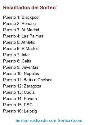 Lista de participantes: Celta, R.Madrid, Juventus, Cadiz, Las Palmas, Betis o Chelsea, Pohang, Inter, Leipzig, Blackpool, Napoles, Bayern, At.Madrid, Zaragoza, Athletic, PSG.