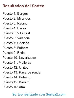 Lista de participantes: United, Racing, Burgos, Leverkusen, Barsa, Pasa de ronda, Mirandes, Villarreal, Atm, Fulham, Bayern, Valencia, Betis, Pohang, Mallorca, Chelsea.
