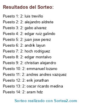 Lista de participantes: 2: hoch rodriguez, 2: juan jose perez, 2: edgar montalvo, 2: gabo alvarez, 2: emmanuel lozano, 2: erik jonathan, 2: andrik layun, 2: luis treviño, 2: alejandro aldrete, 2: edgar ruiz galindo, 2: andres andres vazquez, 2: christian alejandro, 2: aram hdz, 2: oscar ricardo medina.
