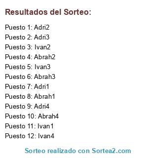 Lista de participantes: Abrah1, Ivan1, Adri1, Abrah2, Ivan2, Adri2, Abrah3, Ivan3, Adri3, Abrah4, Ivan4, Adri4.