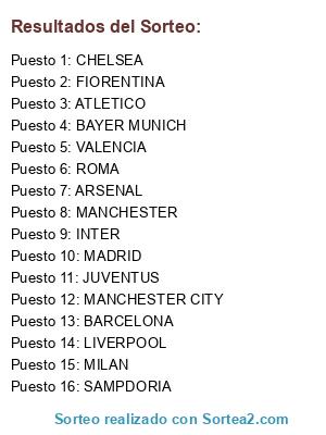 Lista de participantes: INTER, MILAN, MADRID, BARCELONA, MANCHESTER, CHELSEA, ROMA, BAYER MUNICH, JUVENTUS, LIVERPOOL, ARSENAL, ATLETICO, VALENCIA, MANCHESTER CITY, FIORENTINA, SAMPDORIA.