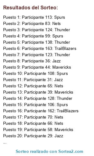 Lista de participantes: Participante 1: Jazz, Participante 2: Jazz, Participante 3: Jazz, Participante 4: Jazz, Participante 5: Jazz, Participante 6: Jazz, Participante 7: Jazz, Participante 8: Jazz, Participante 9: Jazz, Participante 10: Jazz, Participante 11: Jazz, Participante 12: Jazz, Participante 13: Jazz, Participante 14: Jazz, Participante 15: Jazz, Participante 16: Jazz, Participante 17: Jazz, Participante 18: Jazz, Participante 19: Jazz, Participante 20: Jazz, Participante 21: Jazz, Participante 22: Jazz, Participante 23: Jazz, Participante 24: Jazz, Participante 25: Jazz, Participante 26: Jazz, Participante 27: Jazz, Participante 28: Jazz, Participante 29: Jazz, Participante 30: Jazz, Participante 31: Jazz, Participante 32: Jazz, Participante 33: Jazz, Participante 34: Jazz, Participante 35: Jazz, Participante 36: Jazz, Participante 37: Jazz, Participante 38: Mavericks, Participante 39: Mavericks, Participante 40: Mavericks, Participante 41: Mavericks, Participante 42: Mavericks, Participante 43: Mavericks, Participante 44: Mavericks, Participante 45: Mavericks, Participante 46: Mavericks, Participante 47: Mavericks, Participante 48: Mavericks, Participante 49: Mavericks, Participante 50: Mavericks, Participante 51: Mavericks, Participante 52: Mavericks, Participante 53: Mavericks, Participante 54: Mavericks, Participante 55: Mavericks, Participante 56: Mavericks, Participante 57: Mavericks, Participante 58: Mavericks, Participante 59: Mavericks, Participante 60: Mavericks, Participante 61: Mavericks, Participante 62: Mavericks, Participante 63: Mavericks, Participante 64: Mavericks, Participante 65: Nets, Participante 66: Nets, Participante 67: Nets, Participante 68: Nets, Participante 69: Nets, Participante 70: Nets, Participante 71: Nets, Participante 72: Nets, Participante 73: Nets, Participante 74: Nets, Participante 75: Nets, Participante 76: Nets, Participante 77: Nets, Participante 78: Nets, Participante 79: Nets, Participante 80: Nets, Participante 81: Nets, Participante 82: Nets, Participante 83: Nets, Participante 84: Nets, Participante 85: Nets, Participante 86: Nets, Participante 87: Nets, Participante 88: Nets, Participante 89: Nets, Participante 90: Nets, Participante 91: Nets, Participante 92: Nets, Participante 93: Spurs, Participante 94: Spurs, Participante 95: Spurs, Participante 96: Spurs, Participante 97: Spurs, Participante 98: Spurs, Participante 99: Spurs, Participante 100: Spurs, Participante 101: Spurs, Participante 102: Spurs, Participante 103: Spurs, Participante 104: Spurs, Participante 105: Spurs, Participante 106: Spurs, Participante 107: Spurs, Participante 108: Spurs, Participante 109: Spurs, Participante 110: Spurs, Participante 111: Spurs, Participante 112: Spurs, Participante 113: Spurs, Participante 114: Spurs, Participante 115: Spurs, Participante 116: Spurs, Participante 117: Spurs, Participante 118: Spurs, Participante 119: Spurs, Participante 120: Thunder, Participante 121: Thunder, Participante 122: Thunder, Participante 123: Thunder, Participante 124: Thunder, Participante 125: Thunder, Participante 126: Thunder, Participante 127: Thunder, Participante 128: Thunder, Participante 129: Thunder, Participante 130: Thunder, Participante 131: Thunder, Participante 132: Thunder, Participante 133: Thunder, Participante 134: Thunder, Participante 135: Thunder, Participante 136: Thunder, Participante 137: Thunder, Participante 138: Thunder, Participante 139: Thunder, Participante 140: Thunder, Participante 141: Thunder, Participante 142: Thunder, Participante 143: Thunder, Participante 144: Thunder, Participante 145: Thunder, Participante 146: Thunder, Participante 147: Thunder, Participante 148: Thunder, Participante 149: Thunder, Participante 150: TrailBlazers, Participante 151: TrailBlazers, Participante 152: TrailBlazers, Participante 153: TrailBlazers, Participante 154: TrailBlazers, Participante 155: TrailBlazers, Participante 156: TrailBlazers, Participante 157: TrailBlazers, Participante 158: TrailBlazers, Participante 159: TrailBlazers, Participante 160: TrailBlazers, Participante 161: TrailBlazers, Participante 162: TrailBlazers, Participante 163: TrailBlazers, Participante 164: TrailBlazers, Participante 165: TrailBlazers, Participante 166: TrailBlazers.