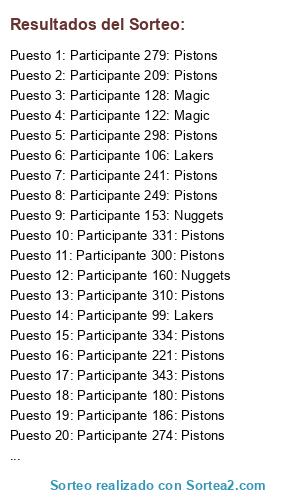 Lista de participantes: Participante 1: Hawks, Participante 2: Hawks, Participante 3: Hawks, Participante 4: Hawks, Participante 5: Hawks, Participante 6: Hawks, Participante 7: Hawks, Participante 8: Hawks, Participante 9: Hawks, Participante 10: Hawks, Participante 11: Hawks, Participante 12: Hawks, Participante 13: Hawks, Participante 14: Hawks, Participante 15: Hawks, Participante 16: Hawks, Participante 17: Hawks, Participante 18: Hawks, Participante 19: Hawks, Participante 20: Hawks, Participante 21: Hawks, Participante 22: Hawks, Participante 23: Hawks, Participante 24: Hawks, Participante 25: Hawks, Participante 26: Heat, Participante 27: Heat, Participante 28: Heat, Participante 29: Heat, Participante 30: Heat, Participante 31: Heat, Participante 32: Heat, Participante 33: Heat, Participante 34: Heat, Participante 35: Heat, Participante 36: Heat, Participante 37: Heat, Participante 38: Heat, Participante 39: Heat, Participante 40: Knicks, Participante 41: Knicks, Participante 42: Knicks, Participante 43: Knicks, Participante 44: Knicks, Participante 45: Knicks, Participante 46: Knicks, Participante 47: Knicks, Participante 48: Knicks, Participante 49: Knicks, Participante 50: Knicks, Participante 51: Knicks, Participante 52: Knicks, Participante 53: Knicks, Participante 54: Knicks, Participante 55: Knicks, Participante 56: Knicks, Participante 57: Knicks, Participante 58: Knicks, Participante 59: Knicks, Participante 60: Knicks, Participante 61: Knicks, Participante 62: Knicks, Participante 63: Knicks, Participante 64: Knicks, Participante 65: Knicks, Participante 66: Knicks, Participante 67: Knicks, Participante 68: Knicks, Participante 69: Knicks, Participante 70: Knicks, Participante 71: Knicks, Participante 72: Knicks, Participante 73: Knicks, Participante 74: Knicks, Participante 75: Knicks, Participante 76: Knicks, Participante 77: Knicks, Participante 78: Knicks, Participante 79: Knicks, Participante 80: Knicks, Participante 81: Knicks, Participante 82: Knicks, Participante 83: Knicks, Participante 84: Knicks, Participante 85: Knicks, Participante 86: Lakers, Participante 87: Lakers, Participante 88: Lakers, Participante 89: Lakers, Participante 90: Lakers, Participante 91: Lakers, Participante 92: Lakers, Participante 93: Lakers, Participante 94: Lakers, Participante 95: Lakers, Participante 96: Lakers, Participante 97: Lakers, Participante 98: Lakers, Participante 99: Lakers, Participante 100: Lakers, Participante 101: Lakers, Participante 102: Lakers, Participante 103: Lakers, Participante 104: Lakers, Participante 105: Lakers, Participante 106: Lakers, Participante 107: Lakers, Participante 108: Lakers, Participante 109: Lakers, Participante 110: Lakers, Participante 111: Lakers, Participante 112: Lakers, Participante 113: Lakers, Participante 114: Magic, Participante 115: Magic, Participante 116: Magic, Participante 117: Magic, Participante 118: Magic, Participante 119: Magic, Participante 120: Magic, Participante 121: Magic, Participante 122: Magic, Participante 123: Magic, Participante 124: Magic, Participante 125: Magic, Participante 126: Magic, Participante 127: Magic, Participante 128: Magic, Participante 129: Magic, Participante 130: Magic, Participante 131: Magic, Participante 132: Magic, Participante 133: Magic, Participante 134: Magic, Participante 135: Magic, Participante 136: Magic, Participante 137: Nuggets, Participante 138: Nuggets, Participante 139: Nuggets, Participante 140: Nuggets, Participante 141: Nuggets, Participante 142: Nuggets, Participante 143: Nuggets, Participante 144: Nuggets, Participante 145: Nuggets, Participante 146: Nuggets, Participante 147: Nuggets, Participante 148: Nuggets, Participante 149: Nuggets, Participante 150: Nuggets, Participante 151: Nuggets, Participante 152: Nuggets, Participante 153: Nuggets, Participante 154: Nuggets, Participante 155: Nuggets, Participante 156: Nuggets, Participante 157: Nuggets, Participante 158: Nuggets, Participante 159: Nuggets, Participante 160: Nuggets, Participante 161: Nuggets, Participante 162: Nuggets, Participante 163: Nuggets, Participante 164: Nuggets, Participante 165: Nuggets, Participante 166: Nuggets, Participante 167: Nuggets, Participante 168: Nuggets, Participante 169: Nuggets, Participante 170: Nuggets, Participante 171: Nuggets, Participante 172: Nuggets, Participante 173: Pistons, Participante 174: Pistons, Participante 175: Pistons, Participante 176: Pistons, Participante 177: Pistons, Participante 178: Pistons, Participante 179: Pistons, Participante 180: Pistons, Participante 181: Pistons, Participante 182: Pistons, Participante 183: Pistons, Participante 184: Pistons, Participante 185: Pistons, Participante 186: Pistons, Participante 187: Pistons, Participante 188: Pistons, Participante 189: Pistons, Participante 190: Pistons, Participante 191: Pistons, Participante 192: Pistons, Participante 193: Pistons, Participante 194: Pistons, Participante 195: Pistons, Participante 196: Pistons, Participante 197: Pistons, Participante 198: Pistons, Participante 199: Pistons, Participante 200: Pistons, Participante 201: Pistons, Participante 202: Pistons, Participante 203: Pistons, Participante 204: Pistons, Participante 205: Pistons, Participante 206: Pistons, Participante 207: Pistons, Participante 208: Pistons, Participante 209: Pistons, Participante 210: Pistons, Participante 211: Pistons, Participante 212: Pistons, Participante 213: Pistons, Participante 214: Pistons, Participante 215: Pistons, Participante 216: Pistons, Participante 217: Pistons, Participante 218: Pistons, Participante 219: Pistons, Participante 220: Pistons, Participante 221: Pistons, Participante 222: Pistons, Participante 223: Pistons, Participante 224: Pistons, Participante 225: Pistons, Participante 226: Pistons, Participante 227: Pistons, Participante 228: Pistons, Participante 229: Pistons, Participante 230: Pistons, Participante 231: Pistons, Participante 232: Pistons, Participante 233: Pistons, Parti