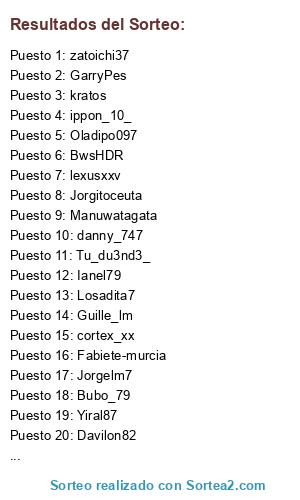Lista de participantes: Tu_du3nd3_, Kimatrai_69, Ianel79, Jorgitoceuta, GarryPes, danny_747, reymago11, migueche, kratos, Oladipo097, Jose_vallecas19, Guille_lm, Bubo_79, Jorgelm7, cortex_xx, Davilon82, zatoichi37, Losadita7, Fabiete-murcia, ippon_10_, Manuwatagata, lexusxxv, Yiral87, BwsHDR.